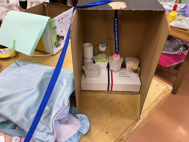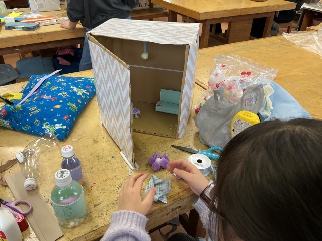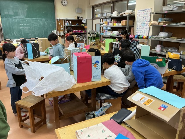 3年生の図工では「スーパーランドセル」を作っています。何がスーパーなのか聞いてみると、ランドセルの中が猫の部屋になっていたり、自動販売機になっていたり、外に羽根がついていたりしました。わくわくするランドセルになるように工夫して作っていました。