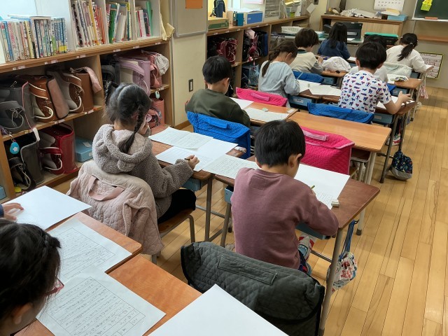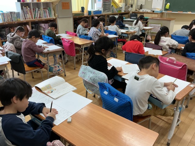 国語の学習では、一年間を振り返って心に残っていることを文にまとめる学習をしています。遠足や水泳、秋遊びなど楽しかったことや嬉しかったことを思い出していました。集中して丁寧に書いていて、この一年の成長を感じました。