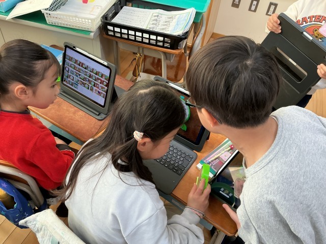 1年生の算数もまとめの時期に入ってきました。今日は模型時計を使って「何時何分」の学習をしました。長針が何時を表し、短針が何分を表していることを確認しました。その後、隣の友達と何時何分か模型時計を使って問題を出し合い、タブレットで写真を撮ってクラスみんなで何時何分か問題を出し合いました。時計の学習は算数の時間だけでなく、普段から取り組んできたこともあり、自信があったようです。