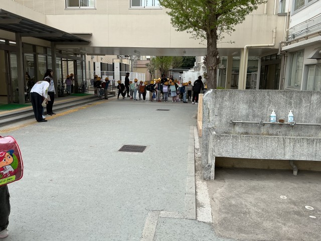 学校生活1日目が終わりました。しばらくはコースごとに帰ります。初めてコースごとに並びましたが、上手に集まっていました。「さようなら」と元気に挨拶をしてにこにこ帰っていきました。明日も待っています。