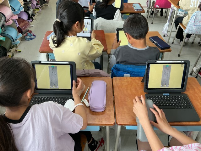 4年生の国語の学習では、自分の好きなものや身近なものは、どんなことを見たり、聞いたり、感じたりしているのか、ものになりきって書く学習をしています。ものを一つ選び、選んだものがどんなことを考えているか想像しました。なりきって書いた文章をロイロノートで友達と共有しました。友達の書いた文章を読んで「本物みたいだ」「考えていることが面白い」という感想が出てきました。実際にはなれないものの視点で書くことで、書く楽しさを感じるとともに、物語を読むときに書き手の視点に着目するきっかけになればと思います。