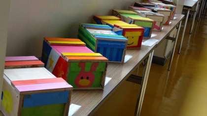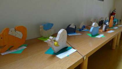 東校舎2階図工室の廊下に、図工の作品が展示してあります。今回新たに展示したのは5・6年の木工作です。6年生は、大工さんに作り方を教えていただいた道具箱です。形は同じですが、装飾の絵を工夫しました。5年生は厚い板を糸のこぎりで切り抜き作った動物です。どちらも子どもたちの個性が出ていてすてきな作品です。ご来校の際にはぜひご覧下さい。