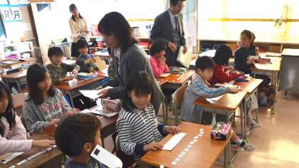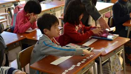 6日(木)午後、3年生の算数研究授業を行いました。担任と算数少人数担当教諭の2人が2つの教室で授業を行いました。この写真は担任が行った授業のようすです。「小数」の「数の構成」について学習しました。袋に入っている「10」「1」「0.1」の札を12枚ランダムに取り出し、その合計を考えました。0.1が10個集まると1になるということがわかり、「整数としんせきのようだね」と発言した子がいて、みんな納得したようです。多様な考え方を生かして授業を進めています。