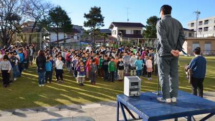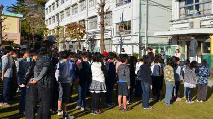 10日(月)、今朝はこの冬1番の冷え込みで、登校途中に霜柱を見つけてきた子がいました。そんな中、朝会は校庭の芝生の上で行いました。風もなく朝日がさしこむ中、子どもたちは上着を脱いで整列。寒さに身を縮めることなくよい姿勢で、話を聞くことができました。