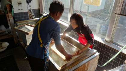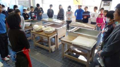 12日(火)、6年生が山崎小学校の伝統工芸室まで出かけ、卒業証書にする紙をすきました。朝8時に学校集合で、徒歩と電車で山崎小学校に到着。4年生の時に紙すき体験をしているので、簡単に説明を受けた後、さっそく紙すき作業に入りました。伝統工芸室の先生に手をとってお手伝いしていただき、真剣な表情で世界にたった1枚の卒業証書をすきます。