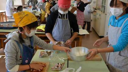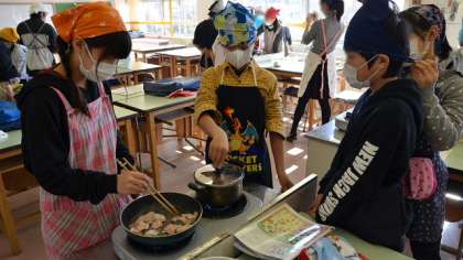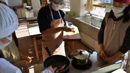 12日、6年生の家庭科は調理実習をしました。ジャガイモ料理です。それぞれの班でメニューを工夫して作ります。材料の買い物も自分たちでしてきました。衛生面に十分注意して、創意工夫をこらしたおかずを作りました。