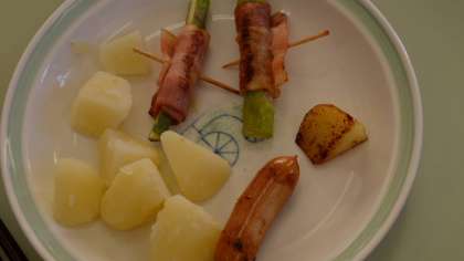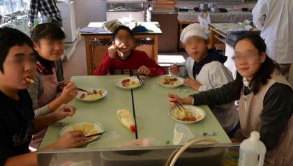 できあがりはこんな感じです。付け合わせを工夫したり味付けを工夫したり、子どもたちの料理への関心の高さがうかがえるできばえですね。協力した班のメンバーで、楽しく会食しました。
