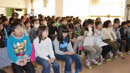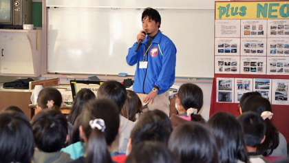 13日5校時、復興支援ボランティア団体「plus NEO」代表、中村健司さんを講師としてお招きして、4・5・6年生が参加して防災教室を行いました。中村さんは本校の卒業生。東日本大震災直後から、津波の被害にあった宮城県東松島市でボランティア活動を続けている方です。震災の記憶が薄れつつある今、実際に復興支援に携わっている方から、災害の状況とそこで暮らす人々の生活について聞くことによって、子どもたちの災害に備える意識を高めること、万が一の時にどう行動しどう生き抜くかという自助の力を養うことも狙っています。さらにキャリヤ教育の一環として、ボランティア活動に取り組む先輩の姿を紹介して、自分の生き方について考える機会としたいと考えました。子どもたちは、活動の様子を写真やビデオで説明していただき、真剣に見つめ聞いていました。
