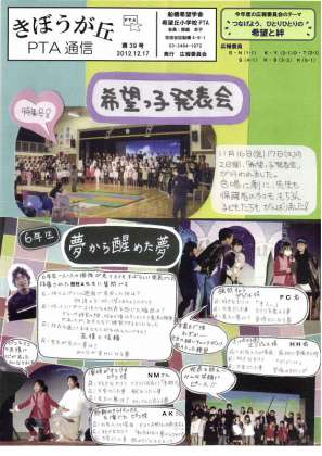 PTA通信の第38号が発行されました。希望っ子発表会の特集号です。今号は手書きにこだわりあり。パソコンで編集するのも良いと思いますが、今回は写真を切り抜き手書きの文字で構成しました。ひと味ちがった雰囲気に仕上がりました。4ページ構成で、希望っ子発表会のエピソードを楽しく掲載してあります。全ページご覧になりたい方は、上のタグ「PTA」のところを開いてください。