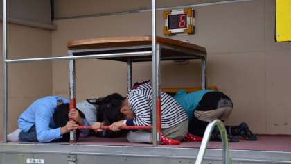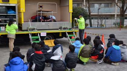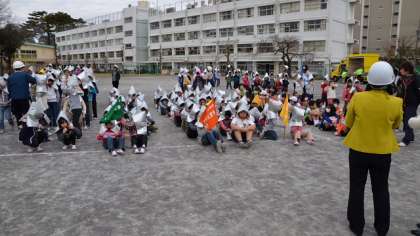 19日9時30分から避難訓練を行いました。地震発生、その後給食室で火災発生という想定です。曇り空に強い北風が吹き付ける中の訓練となりましたが、みんな「お・か・し・も」の約束を守って整然と避難できたことはすばらしいと思いました。その後、3年生と5年生は「起震車」で震度7の体験をしました。万が一の時、自分がどのように行動すべきか考える、貴重な体験になりました。