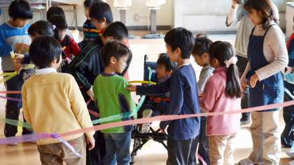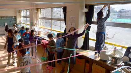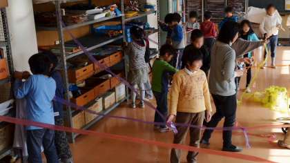 19日(水)、3年生が図工の時間に創作活動の授業を行いました。この日は、「複籍交流」の3年生児童が本校を訪れることになっていたので企画した授業です。「複籍交流」というのは、学区から特別支援学校に通っている児童が本校にも学籍を置いていて、学校通信や学年通信のやりとりを行ったり、行事や授業に訪れて参観・参加したりすることです。今日の3時間目にK君が学校に到着すると3年生の子どもたちは大歓迎。さっそく図工室で創作活動に取りかかりました。課題は、スズランテープ(ダイボリンテープ)で、図工室をクモの巣のようにすることです。