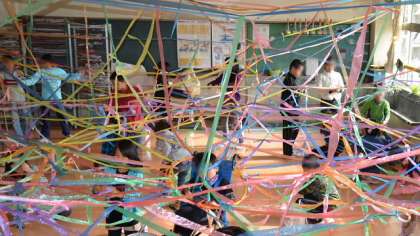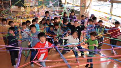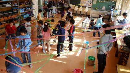クモの巣の中心はK君です。K君がもつ輪にクモの巣を結びつけます。結ぶときにみんなやさしく声をかけています。みんな楽しく活動してできあがったクモの巣の見事なこと。みんなで記念撮影をしました。どの子もとても楽しそうな顔をしています。