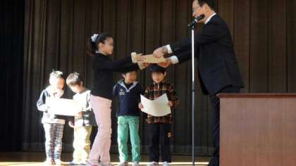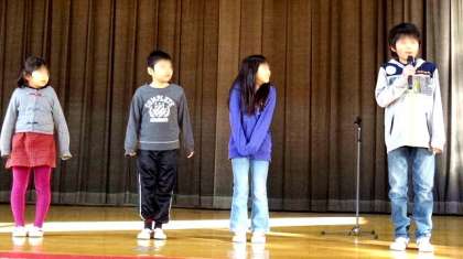 生活指導の話しの後は、2学期のエコ活動の表彰です。牛乳パックとペットボトルキャップのリサイクルにがんばったクラスの表彰です。どのクラスもよく協力してくれました。最後に、2学期で希望丘小学校から転校する4名の児童を紹介し、一人ずつお別れのあいさつをしてもらいました。ちょっとしんみりした気分になりましたが、大きな拍手で見送って励ましました。
