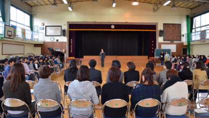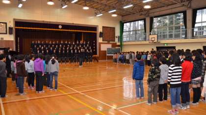 27日(木)、今年も残すところ今日も数えて5日です。昨日からこのページでこの1年を写真で振り返っています。今日は3月と4月です。まずは、3月。この月で最後となった希望丘中学校との合唱交流です。体育館に2年生に来てもらって、中学生の歌声に感動し、一緒に合唱をしました。今となるとよい思い出です。3月といえば卒業の時期。保護者の方も来校して体育館で「感謝の会」を行いました。下の写真は、6年生が希望丘小学校伝統の「みかぐら」を引き継いだ時のようすです。