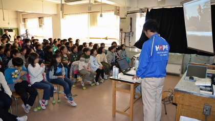 6年生は卒業証書に使う和紙をすいてきました。世界で一枚の手作り卒業証書になります。本校の卒業生で、東日本大震災の津波被害をうけた石巻で復興支援にあたっている方をお招きして、5・6年生がお話を聞きました。その後、保護者、地域の皆さんもお話を伺い、改めて万が一の災害に備える気持ちを新たにしました。