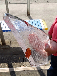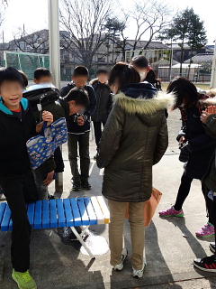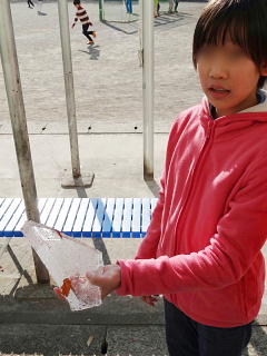 幅跳び用砂場のシートの上にはった分厚い氷を中休みに見つけてきた見せに来てくれた6年生。3センチメートルはありそうです。日当たりのよいベンチの上に置いておいたところ、1時間半後の下校のころにもまだ残っていて、6年生の間で話題になっていました。寒い日が続いています。今年、まだプールは結氷していませんが、いつごろ凍るでしょうか?