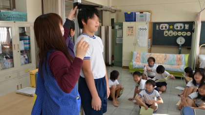 10日は4・5・6年の発育測定をしました。写真は5年生のようすです。伸び盛りの高学年。2学期に比べて身長が伸びています。中には養護の先生の身長を抜いてみんなから歓声が上がる場面もありました。