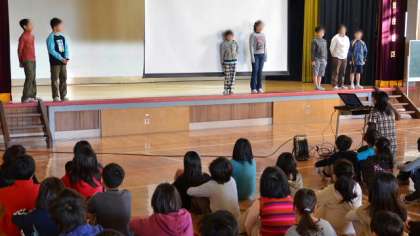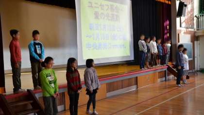 11日朝の集会は、児童会運営委員、代表委員主催の「ユニセフ募金」をよびかける集会でした。プレゼンのスライドに子どもたちの寸劇をまじえて、ユニセフ募金の意義をわかりやすく伝えることができました。聞く方の子どもたちも、真剣な表情でした。明日から、朝登校時に、運営委員と代表委員が玄関に立って募金活動をします。ご協力をお願いします。