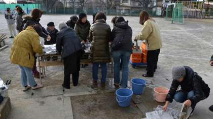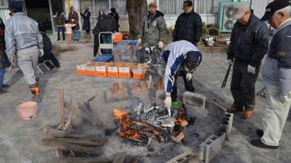 12日、給水訓練の参加賞として子どもたちに配る焼き芋の準備のため、避難所運営委員の皆さんが会が始まる前に校庭に集まって、作業をしてくださいました。寒い校庭で一生懸命の作業ありがとうございました。