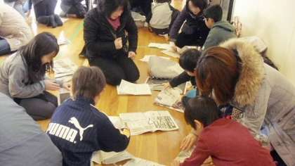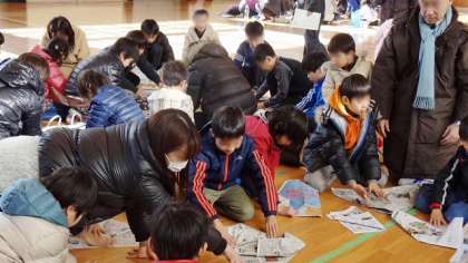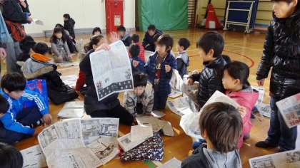 体育館では保護者の方々の指導で、1年生から6年生まで一緒に持参した新聞紙を折って、紙皿やコップの形の役に立つ容れ物を作りました。高学年の子が低学年の子に一生懸命教えて、みんなが作ることができました。避難所生活などで、ちょっとした物を入れるのにも役立つと思います。災害時には、いつも使っている物が足りなくなる状況が予想されます。そのような時に、工夫して生活することのヒントになればと思います。