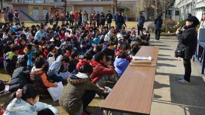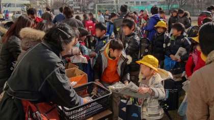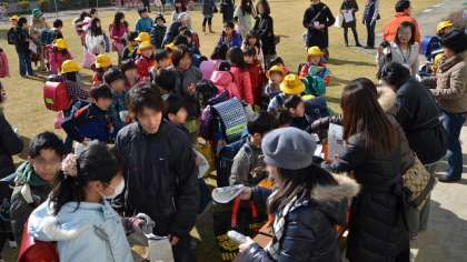 給水訓練と防災教室終了後、避難所運営委員長からお話しをしていただき終了。子どもたちは一旦教室に戻り下校の準備をして、カバンとペットボトルに汲んだ水をもって校庭に集合。避難所運営委員の皆さんがご褒美として焼いてくださった焼き芋をいただいて、帰りました。地域にある防災関連施設を子どもたち見学しその意義を知ること。そして、日頃からいざという時に備えることを学んだ日でした。