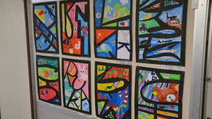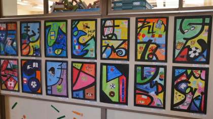 いつもお知らせしている図工室前の展示です。新たに5年生と3年生の作品が展示してあります。写真は5年生。自分の名前をモチーフにして黒い紙を切り抜き、背景の水彩のデザインがと関係づけています。子どもたちの工夫がおもしろいですね。