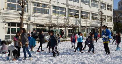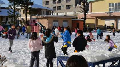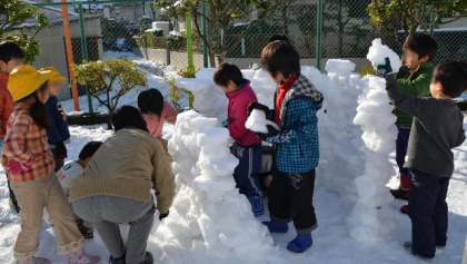 遊んでいるうちに、雪を使って様々な工夫が見られました。一番下の写真では、凍った表面を重ねているところです。みんなで雪遊びをするのは、東京では滅多にできない経験だと思います。雪の冷たさや、雪の質の違いを体験した子どもたちです。