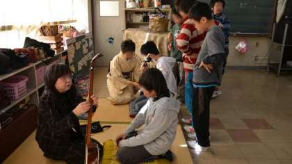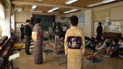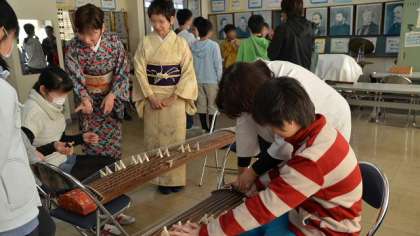 箏や三味線は、弦のはじき方で音が変わります。尺八は一生懸命吹いてもなかなか音が出ません。それでも専門の先生方の熱心な指導でどの子も音を出せるようになりました。指導の先生方はPTA会長さんの紹介でお世話になりました。着物姿もあでやかに、和の世界を味わった1時間でした。講師の先生方ありがとうございました。