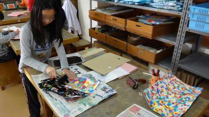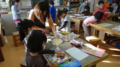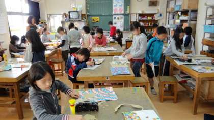 図工の時間は、子どもたちの表現力全開です。4年生は色とりどりの貼り絵の上に、形をはりつけ、ローラーでインクをのせて紙版画を作りました。作品は版画と台紙の両方です。最近は、このように工夫された教材があって楽しいですね。