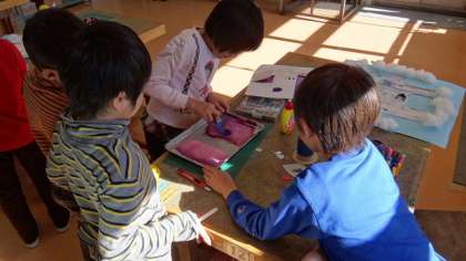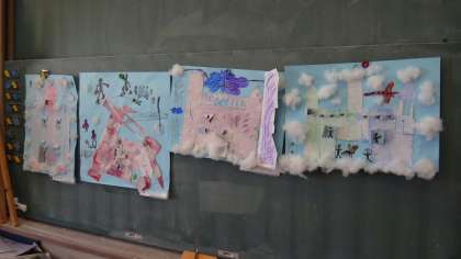こちらは2年生の図工のようす。お城の切り絵を台紙にはって、ふわふわの雲(綿)を貼り付けて完成。これも夢のある楽しい作品ですね。