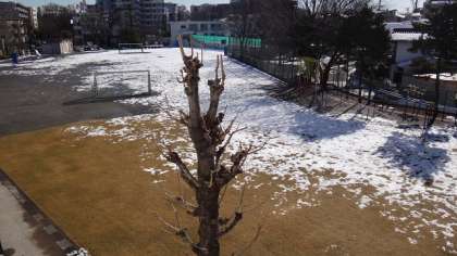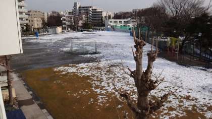 先週降った雪で校庭が真っ白になり、校庭遊びや体育ができません。それでも太陽の熱で少しずつ雪がとけています。早く使えるようになればよいのですが。