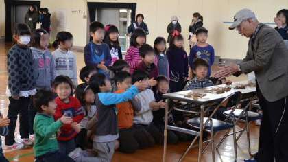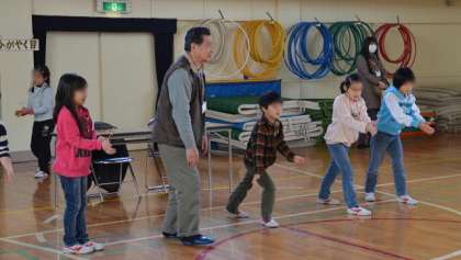 よく飛ぶ竹とんぼを用意していただき、回し方を習い、さあ挑戦です。ところが、やってみると以外に難しく、教えてもらったとおりには飛びません。それでもていねいに手をとって教えていただき、最後にはみんな飛ばすことができるようになりました。