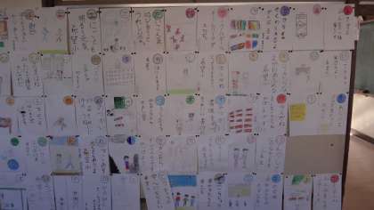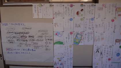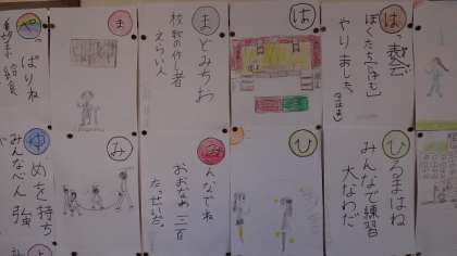 3年生が国語の授業で作ったカルタが教室前に掲示してあります。学校の行事や生活のイメージを言葉にして、みんなで作りました。