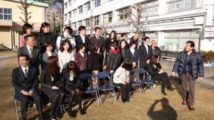 28日朝会の後で、雪が少し残る校庭の芝生の上で、卒業アルバムに掲載する職員の写真撮影を行いました。朝の日差しと雪に反射した光がまぶしくて、しっかり目を開けるのが大変でした。