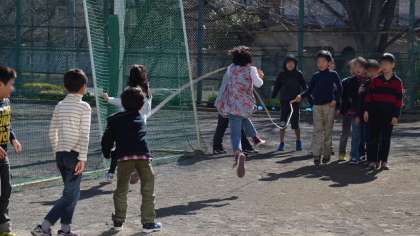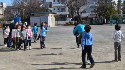 28日朝うっすらと積もった雪は、昼には跡形もなくとけて、昼休みはいつものように元気よく外遊び。2年生と4年生が子どもたちだけで長なわとびをしていました。互いに声をかけ励まし合いながら楽しそうにとんでいました。