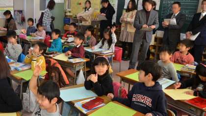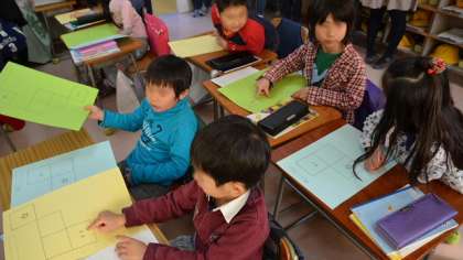 30日(水)午後、1年生の算数研究授業を行いました。今年度も各学年が研究授業を行い、この日が最後です。大きな数の学習で、前の時間に0〜99までの数を整理して(1段目に0〜9、2段目に10〜19・・・)並べた表をつくりました。今日はその表の一部を切り取ってパズルにして考える授業です。並び方のきまりがわからないと解けません。ただ覚えるのではなく、考えて自分で解いてみることによって理解を深めるねらいがあります。