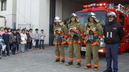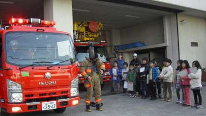 1日(金)、3年生が成城消防署千歳出張所に出かけて、消防署見学をしてきました。最初に消防署員の訓練のようすを見学させていただきました。消防服をすばやく身につけてキビキビと動く消防士さんを見て、思わず「かっこいい」という言葉が出ました。