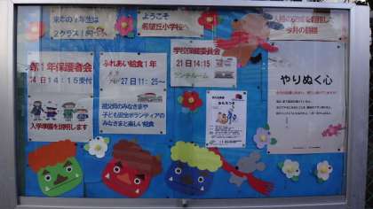 正門前の掲示板が2月ヴァージョンになりました。副校長が担当して、地域へ学校の話題を発信しています。