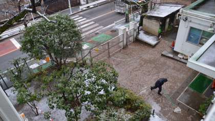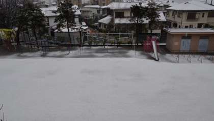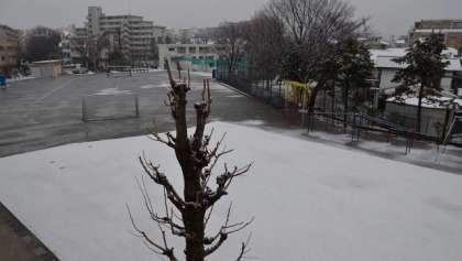 6日(水)、明け方、夜半から降っていた雨が雪に変わって、朝の校庭芝生の上は真っ白になりました。雪は降り続いていますが、比較的気温が高くて道にはあまり積もっていません。