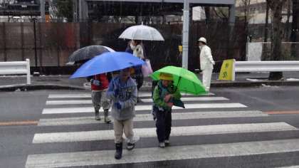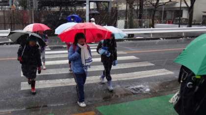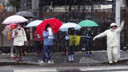 6日朝の登校時間帯。早朝から降り続いている雪は、あまり降り積もることもなく、登校には支障が出ませんでした。それでも、シャーベット状にうっすらと積もった雪は滑りやすいので、横断歩道近くの雪を学校主事が取り除きながら、安全確保をしました。