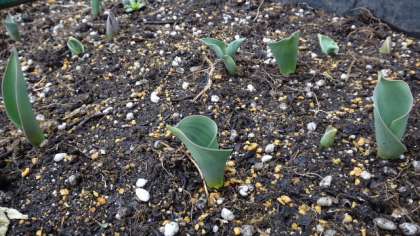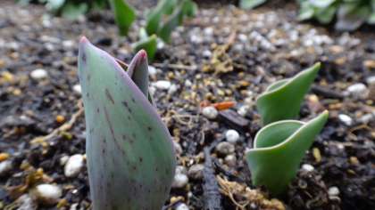 昨日降った雪はほとんど解けましたが、寒い朝となった7日、グーリーンカーテン用の大型プランターに、昨年末にみんなで植えたチューリップが芽を出しました。入学式の頃にはきれいな花を咲かせてくれそうです。
