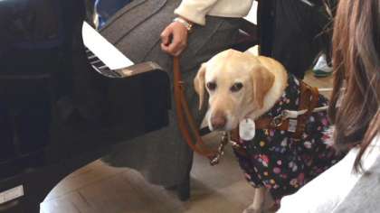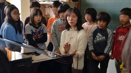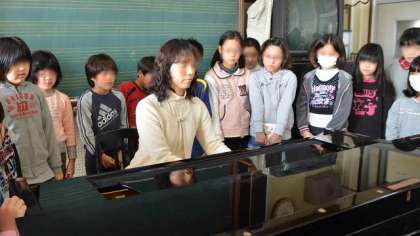 7日、4年生の福祉の学習の一環として、昨年に引き続き、視覚障害のピアニストの方をお招きして、演奏とお話しを聞かせていただきました。盲導犬を連れて来校され、4階の音楽室で、最初はピアノ演奏を聞かせていただきました。全く鍵盤を見ない見事な演奏に子どもたちは感嘆していました。その後子どもたちがピアノの回りを囲んでお話しを聞きました。大勢の子どもたちに囲まれたピアノの足元には、盲導犬が行儀良くすわっています。これにもみんな感心していました。