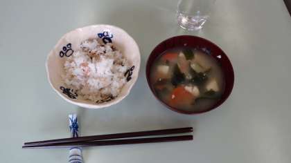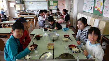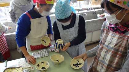 できあがったご飯をよそう茶碗は、図工で作った作品です。オリジナルの食器を使って食べるご飯の味はひとしおだったのではないでしょうか。見てください、この満足そうな表情を! これで、家庭でも食事作りのお手伝いができますね。