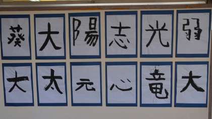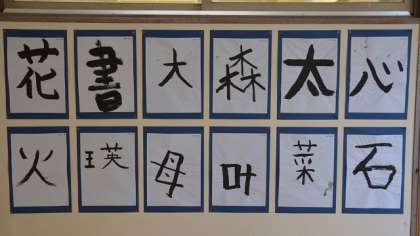 2年生教室の廊下に貼られている毛筆作品です。教科日本語で、はじめて毛筆を使って書きました。自分の好きな字を選んで、墨汁や筆の使い方に苦労しながら書き上げた貴重な作品です。
