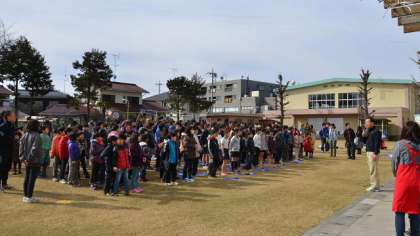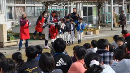 17日(日)、10時から校庭で、遊び場開放委員会主催の恒例「おもちつき」が行われました。みんなでお餅つきを楽しむだけでなく、3月で卒業する6年生をお祝いし、4月から入学する新1年生を歓迎する意味もあります。10時の開会式の時には、多くの子どもたちと保護者・家族の方、地域の方が集まりました。あいさつの後、新1年生の紹介があり、みんなから大きな拍手がわきました。その後に、遊びのコーナーを開いてくれた野球、サッカー、社協の皆さんの紹介もしました。