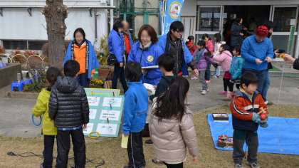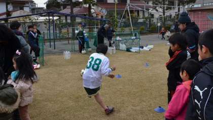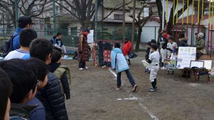 みかぐら演舞披露の後は、お楽しみコーナーで遊びます。野球チーム「レッドジャッカル」は、ストラックアウトのコーナー。サッカー「グリーンファイターズ」は、サッカーボーリングのコーナー。船橋社協の皆さんは輪投げや昔遊びのコーナーを開いてくださり、子どもたちが楽しく遊びました。
