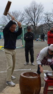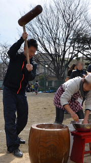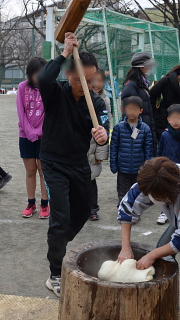 蒸し上がった餅米がうすに入り、餅つきが始まります。委員の皆様だけではなく多くの人が、杵を振り上げ、力いっぱい餅をつきました。写真は本校教員です。