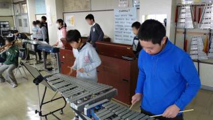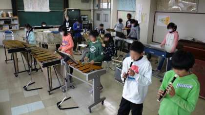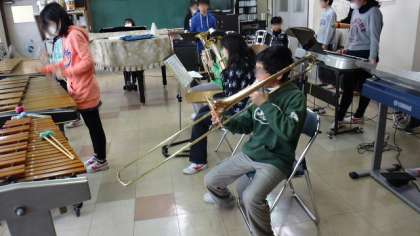 19日、6年生音楽授業のようすです。6年間の集大成として合奏に取り組んでいます。曲は「君の瞳に恋してる」です。この曲は、軽快なリズムのポピュラー音楽の楽曲で、原題は「CAN'T TAKE MY EYES OFF YOU」。耳にすれば「ああ、あの曲か」と思うはずです。金管楽器も含めた様々な楽器を使います。最初の頃はなかなか音を合わせることができませんでしたが、みんな一生懸命練習して、今日は完成に近づいていました。