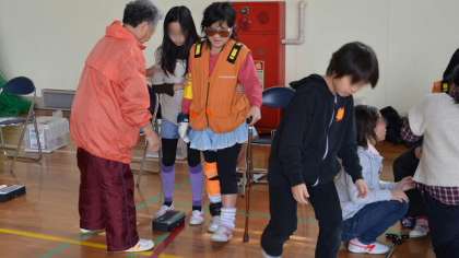おもりのついたベスト、ひざとひじが曲がりにくくするサポーター、視界がかすれせまくなる眼鏡を身につけました。お金を数えたり、字を書いたり、寝転がって立つだけでも大変です。