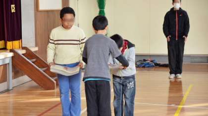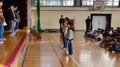 続いて5年生代表の2名が、希望っ子班を引き継ぐ決意を述べました。最後に、6年生から5年生代表に、希望っ子班の「班名プラカード」が手渡され、引き継ぎが終了しました。この時期は、6年生のさまざまな場面で「引き継ぎ」や「最後の・・・」という活動が続きます。